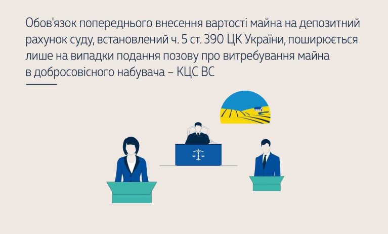 КЦС ВС зазначив, що питання про добросовісність / недобросовісність набувача судом може бути вирішене лише після дослідження доказів на стадії ухвалення судового рішення. У випадку встановлення недобросовісності набувача суд задовольняє позов без застосування ч. 5 ст. 390 ЦК України. Натомість у разі встановлення, що набувач добросовісний, суд відмовляє в задоволенні позову на підставі ч. 5 ст. 390 ЦК України, якщо позивач попередньо не вніс вартість майна на депозитний рахунок суду.